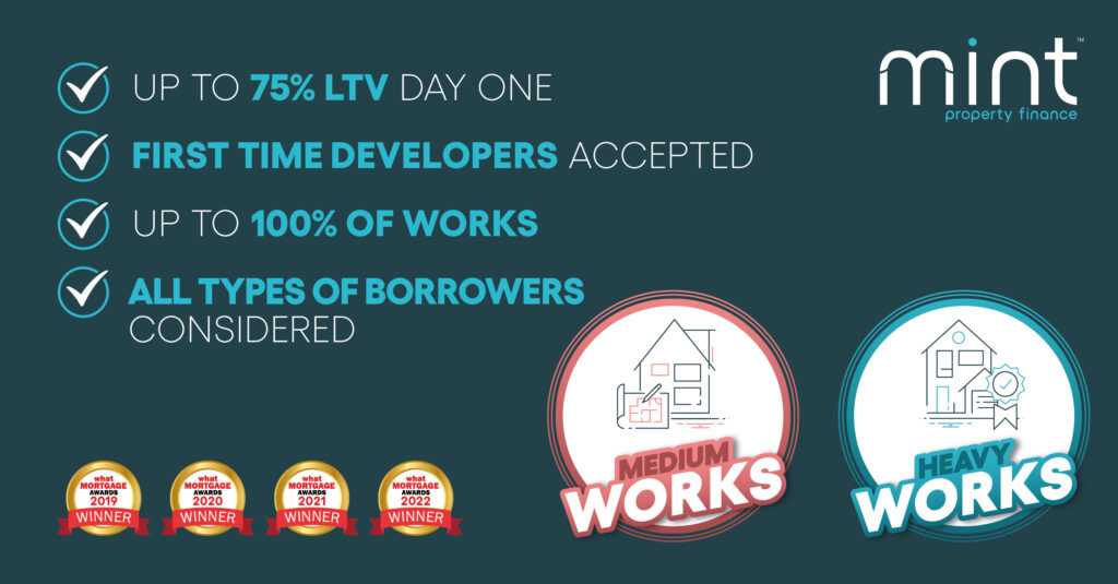 We understand it’s a big step taking on your first deal on your own, but Mint stands apart in the industry in its support of first-time developers. Add this to no minimum term, the offer of second charges up to 70% LTV and reduced rates and higher LTVs for repeat Borrowers, and there’s every reason to contact us today on 0161 710 2006 or hello@mintpf.co.uk.