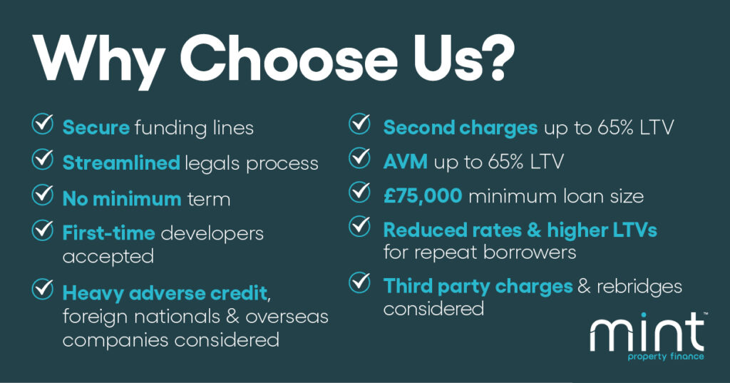 With reduced rates and higher LTVs for repeat borrowers, and third party charge and rebridge enquiries considered, Mint are the go-to lender for all types of Borrowers. Add to that our £75,000 minimum loan size, and these are just some more reasons why Mint Property Finance are the ideal lender to help bring your next property project to life.